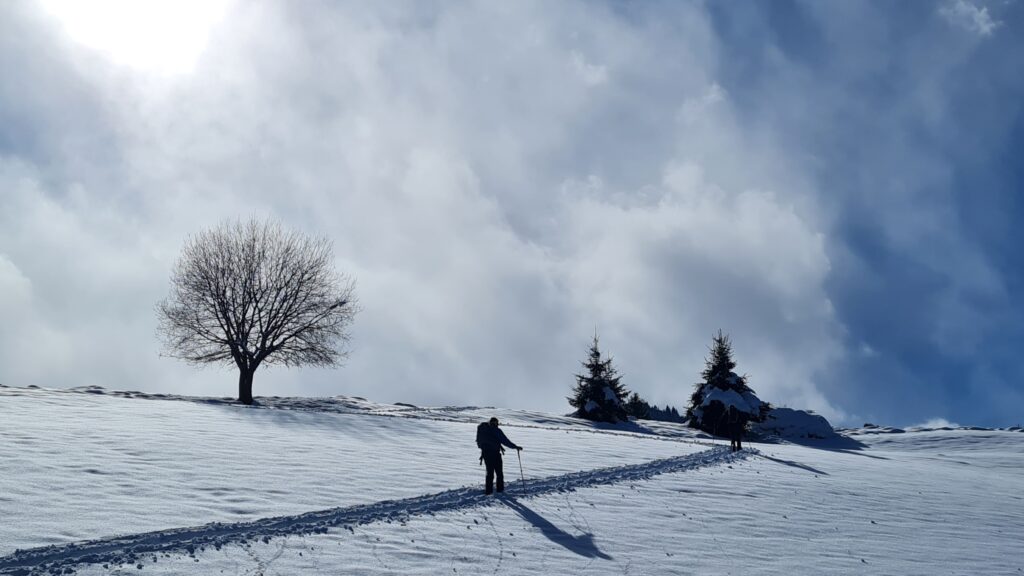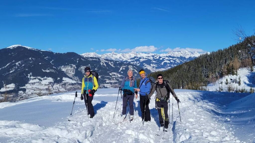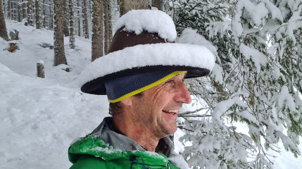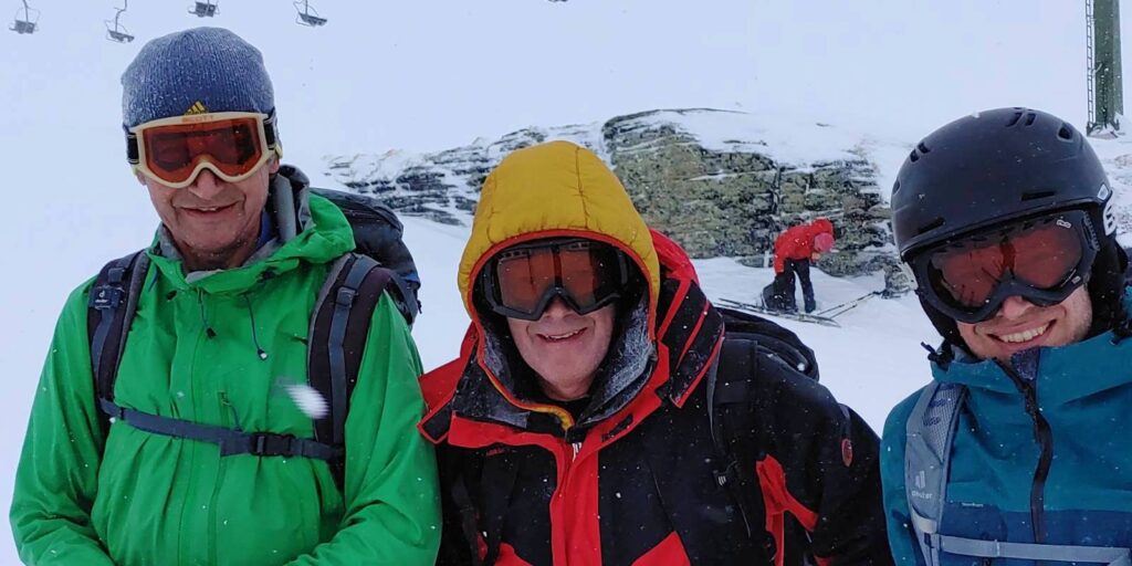Am 14.3.2026 (Tag 2) ging es zunächst bei dichtem Schneefall und wenig Sicht in Richtung der Pürglersgungge (2.500m). Hier hatten wir ausgesprochenes Wetterglück, denn genau am geplanten Umkehrpunkt bei der Steinhütte riss es auf, und wir erlebten einen fantastischen Gipfelerfolg mit nicht minder fantastischer Neuschneeabfahrt. Der Tag endete mit dem obligaten Tarockkurs, den Hias und Klaus für die „Dummies“ (Dietmar und mich) veranstalten – um es vorwegzunehmen: mit wenig Erfolg!