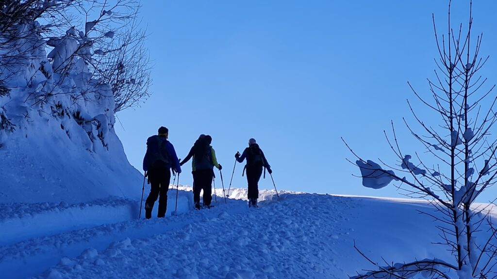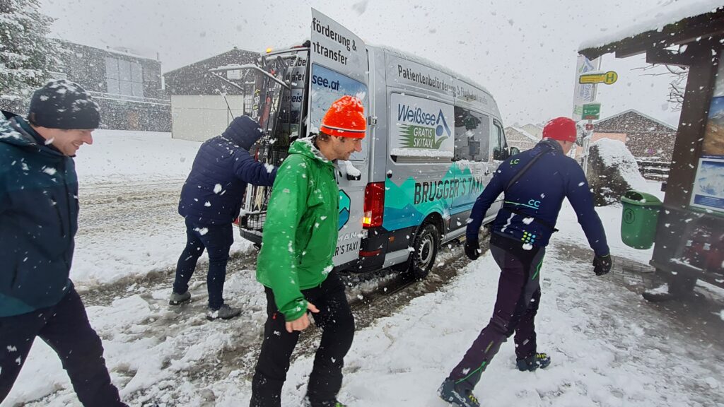Das Wetterglück vom Vortag sollte sich am 3. Tag nicht wiederholen: Wir gerieten am Weg zur Kreuzspitze über dem Rosstal auf Höhe 2.100m in ein Whiteout und entschlossen uns zur Umkehr. Nach der Jause auf den Almen fuhren wir ins Alfental ab, um dort nochmals in Richtung Talende aufzusteigen. Hier allerdings wurden wir Zeugen eines Bergrettungseinsatzes für einen unter dem Marchkinkele verunglückten Tourengehers. Zudem war der Zugang ins Tal durch eine turmhohe Nassschneelawine versperrt (vom Blankenstein), bei der es keine Verschütteten gab, die aber der dahinter aktiven Bergrettung einiges abverlangte. Wir verarbeiteten das Erlebte bei der Elektrolyt-Tankstelle Badlalm.