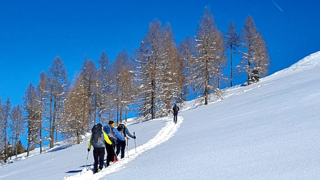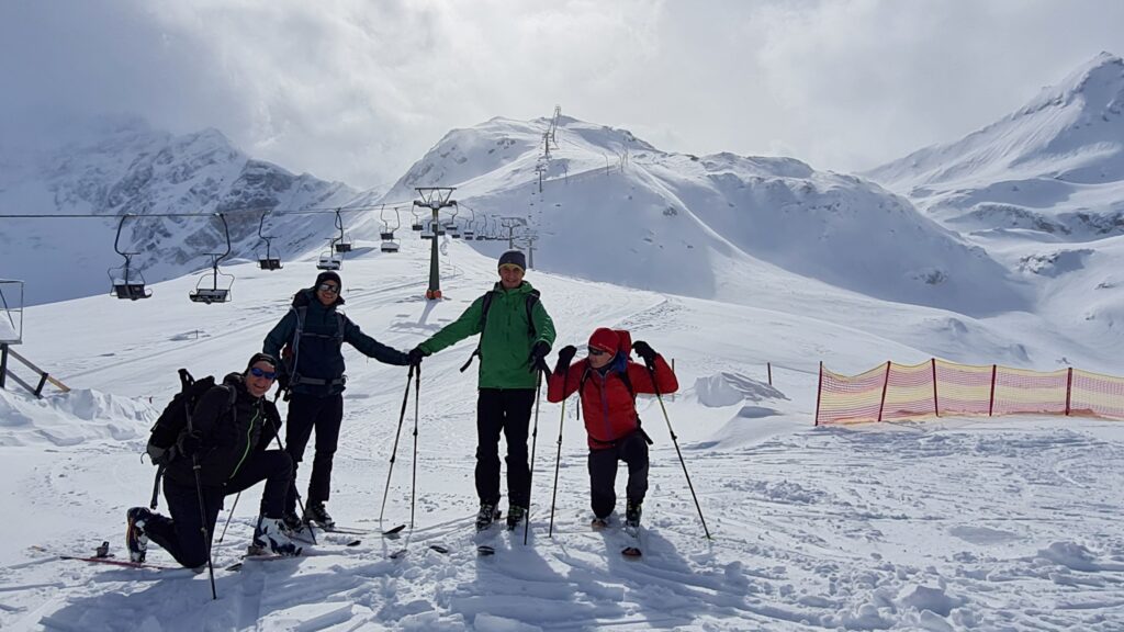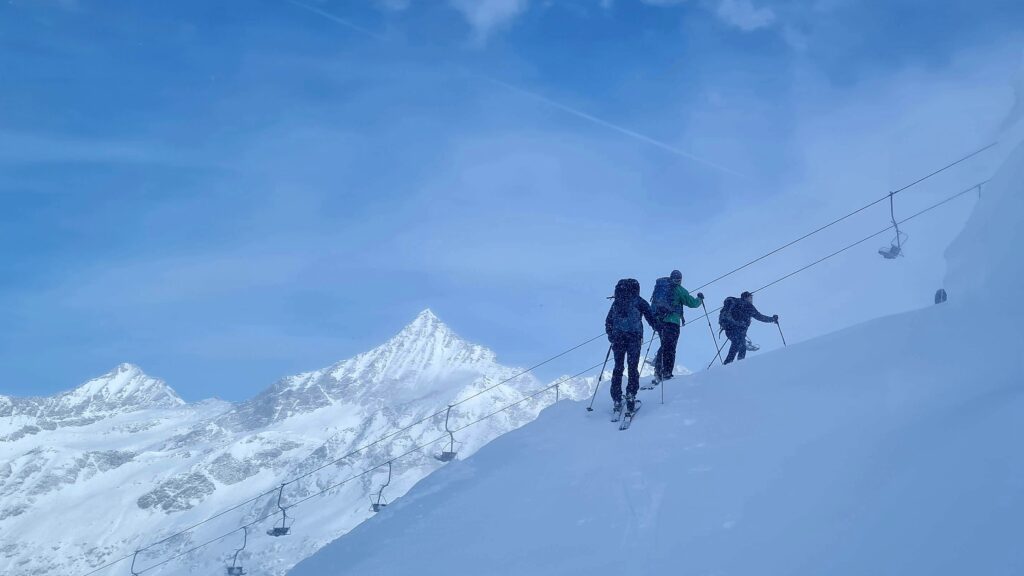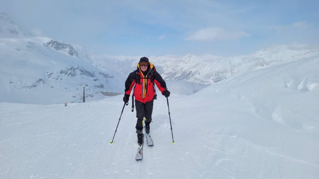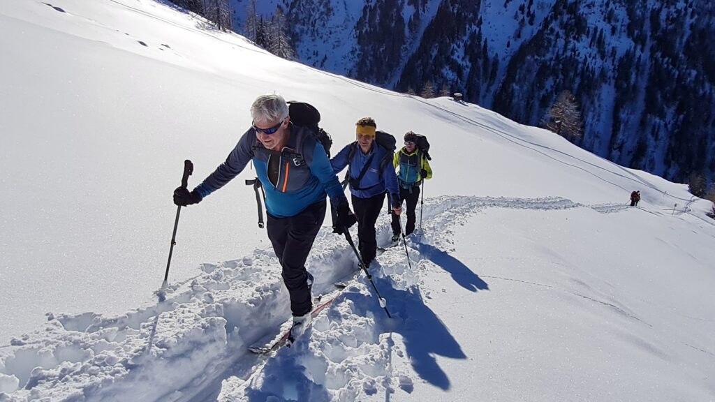 Am Anreisetag, dem 13.3.2025, ging es vom Parkplatz bei der Badlalm zum Gaishörndl (2.615m). Das Wetter wurde dabei immer besser und wir konnten im oberen Bereich der Tour wunderbare Spuren ziehen. Im steilen Bereich über dem Alfental wurde es dann etwas „ruppiger“: viele Spuren im Altschnee hemmten das Abfahrtsvergnügen.