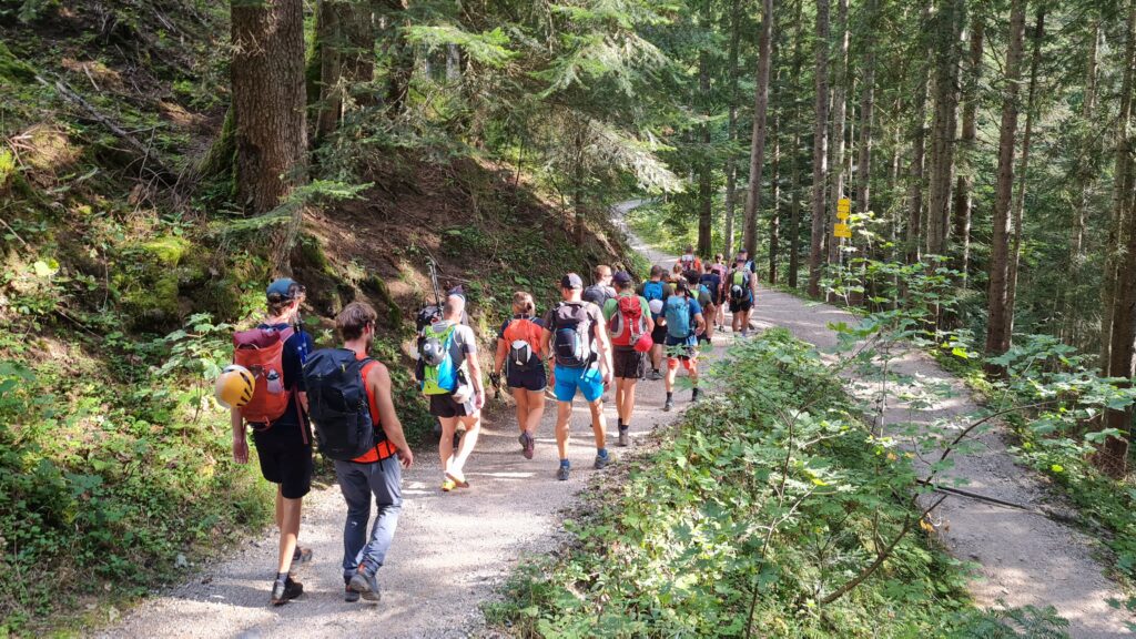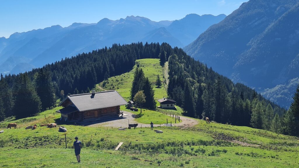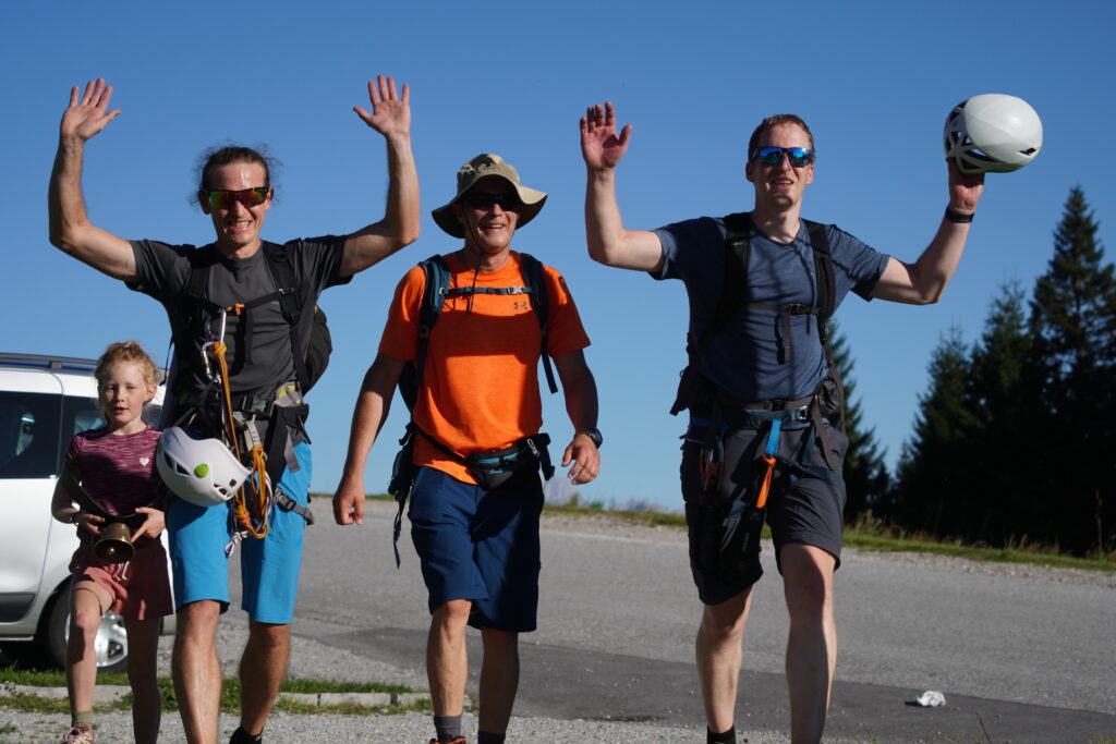 Es folgte das flache Wegstück durch die Talebene zum Moldan und von dort über den Grubachwirt weiter zum Parkplatz am Seewaldsee. Das letzte Stück des Weges führte über den Wanderweg oder über den Klettersteig der Gitschenwand (und es gab einige, die dort wirklich zum Abschluss kletterten – ich nicht) zum Ziel der Wanderung auf der Enzianhütte, wo unsere „Lumpensammler-Gruppe“ gegen 17 Uhr eintraf. Hier gab es für jedes eintreffende Team ein großes Hallo und Applaus. Und dann wurde auch noch ein ausgezeichneter Schweinsbraten aufgetragen: Was für ein Traumtag!