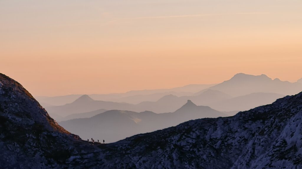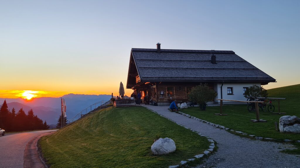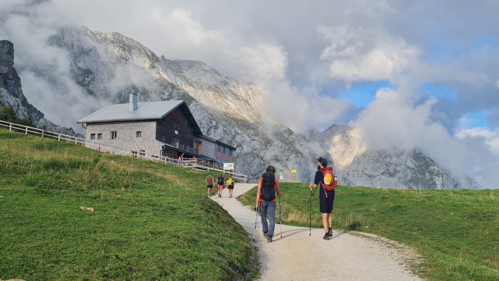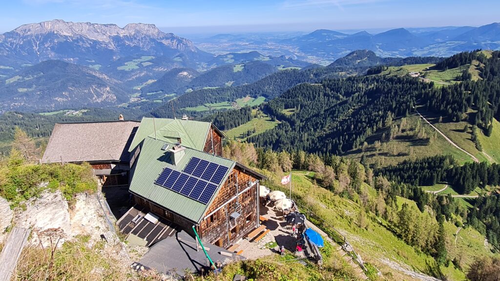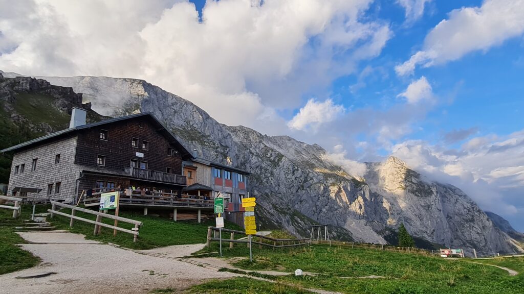 Der Ausgangspunkt der Wanderung, das Carl-von-Stahl-Haus wurde am Vortag (6.9.2024) gemeinsam vom Parkplatz Hinterbrand aus erreicht. Auf der Hütte wurde am Abend gemeinsam gegessen und getrunken, und dann doch recht bald die Nachtruhe angetreten: Denn am nächsten Tag ging es in aller Herrgotts-Früh (ab 4:30 Uhr) los zur Durchquerung von Kuchl. Die 49 TeilnehmerInnen waren in Gruppen von drei und mehr Mitgliedern unterwegs und gingen in Abständen von 2 Minuten vom Stahl-Haus los: Es war stockfinster und die Stirnlampen erleuchteten den Aufstieg zum Hohen Brett wie Glühwürmchen. Und: es war ein Traumtag, an dem keine einzige Wolke den Himmel trübte! Was für ein Glück für diese Wanderung!