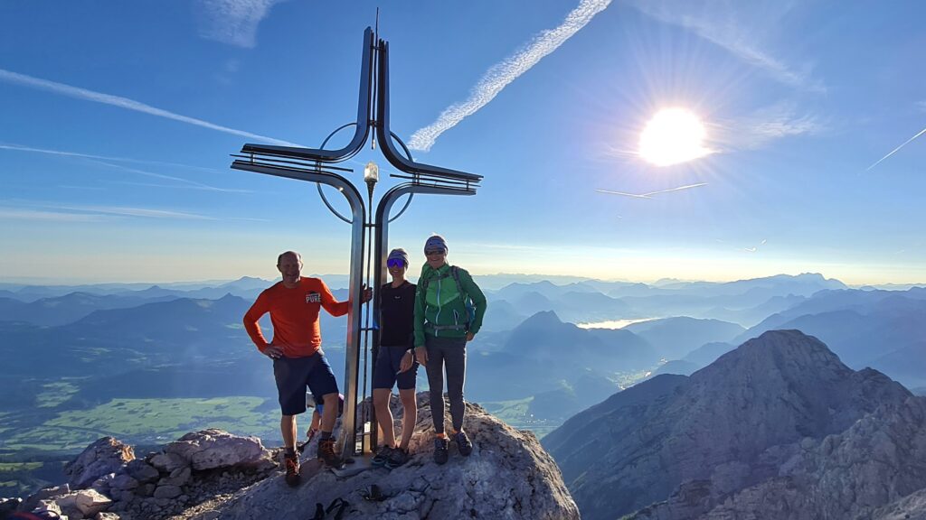 Der erste Höhepunkt war der Sonnenaufgang am Hohen Brett. Dann waren wir schon unterwegs in Richtung Göll. Ich war mit Roland und Christian in der letzten Gruppe unterwegs und wir hatten – zumindest anfänglich – einen guten Überblick über das Geschehen vor uns. Der Gipfel des Hohen Göll wurde kurz vor 8 Uhr erreicht.