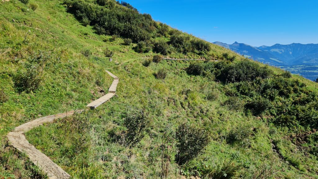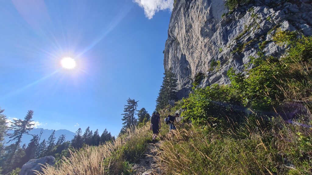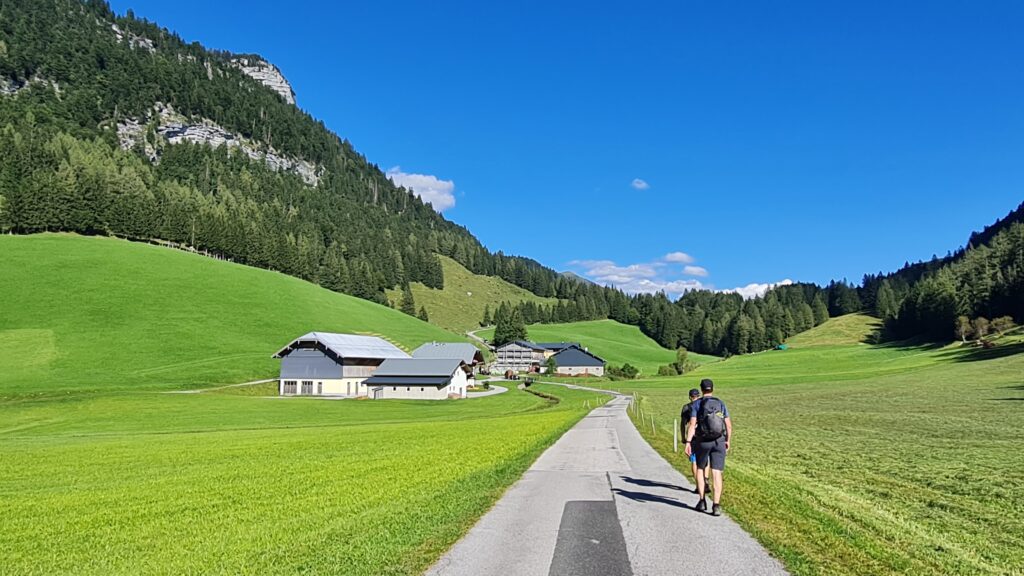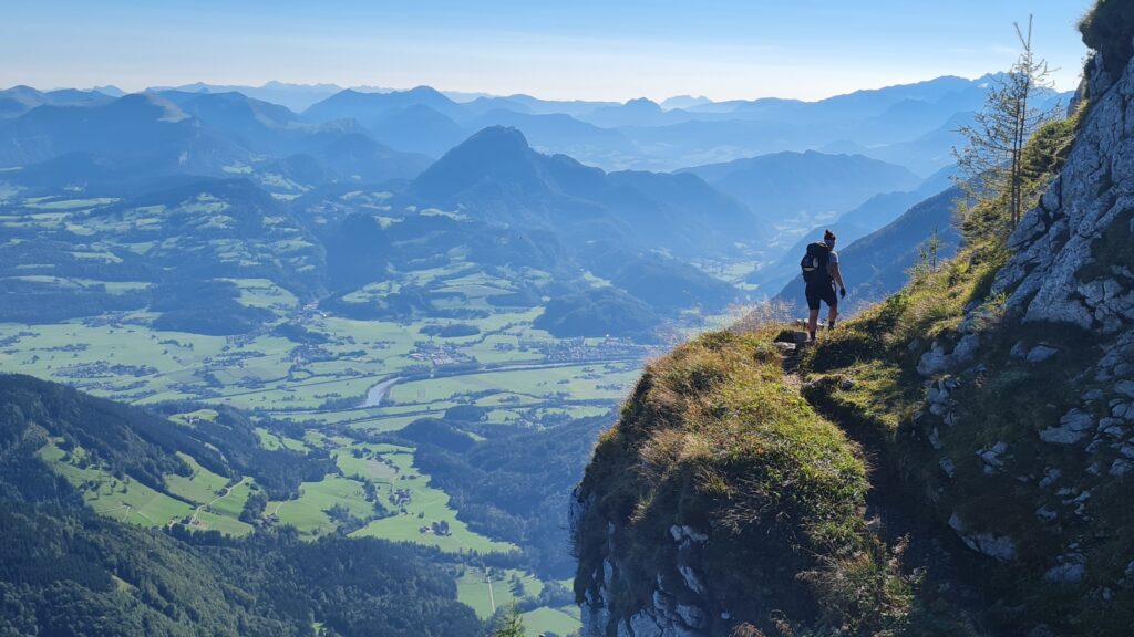 Weiter ging es über die Schusterroute zum Purtschellerhaus, wo eine Verpflegung auf uns wartete. Es folgte der weitere Abstieg über den Eggersattel und den Sonnenweg zur Nesslangeralm und von dort hinunter zum Kuchler Badesee, wo es wieder eine Verpflegung gab. Schon kurz vorher, auf der Salzachbrücke, erwartete mich mein Freund Klaus mit einem kühlen alkoholfreien Bier, das aufgrud der hohen Temperatur im Tal recht willkommen war! Ich übergab ihm dort auch gleich meine Klettersteig-Ausrüstung, die für den Abstieg vom Göll „vorgeschrieben“ war. Mittlerweile war es 13 Uhr.